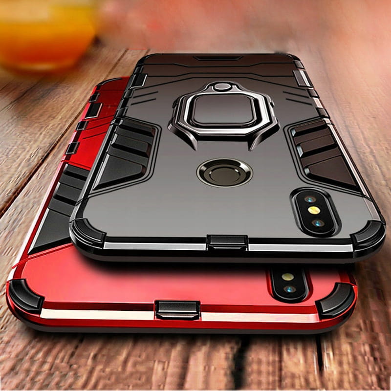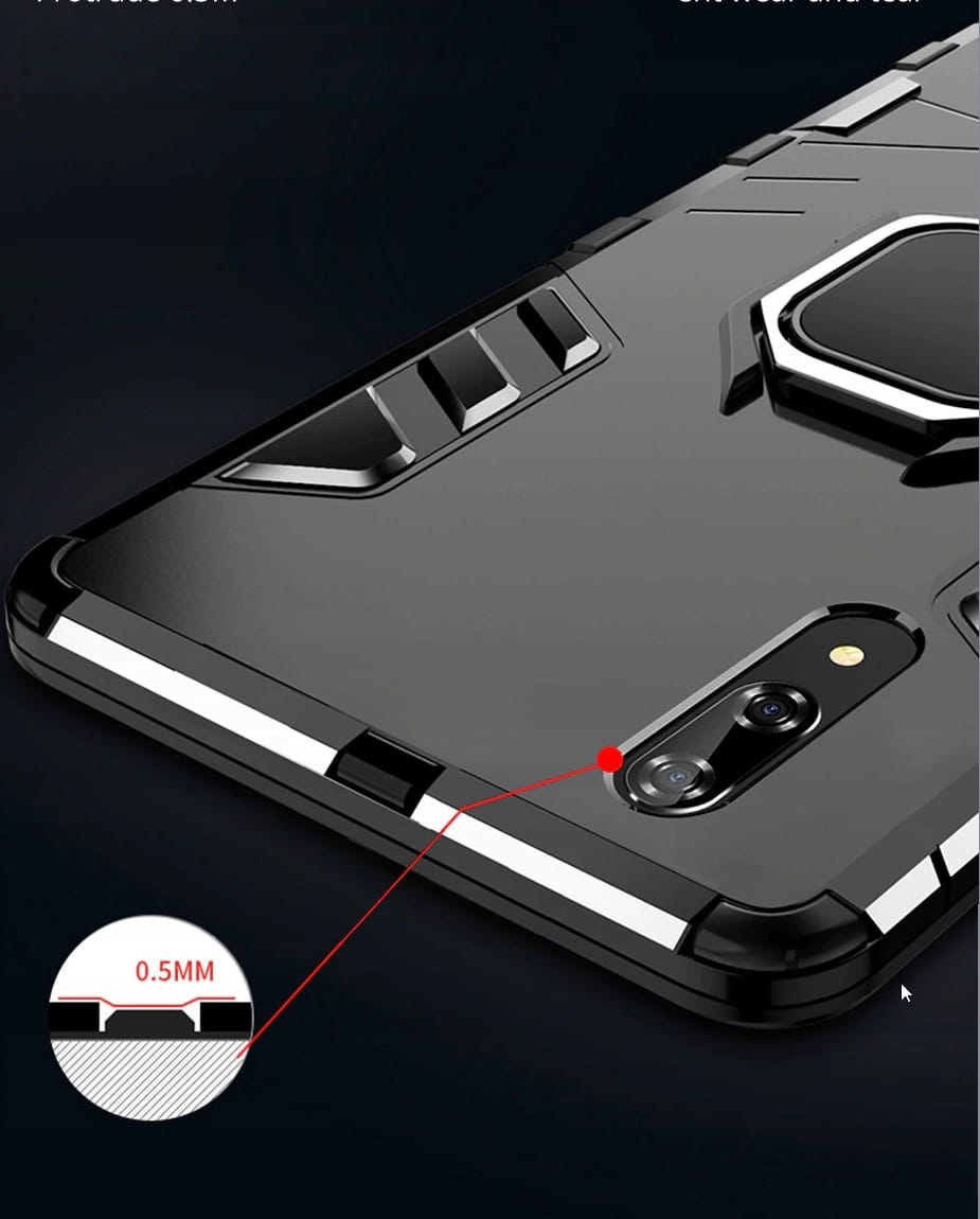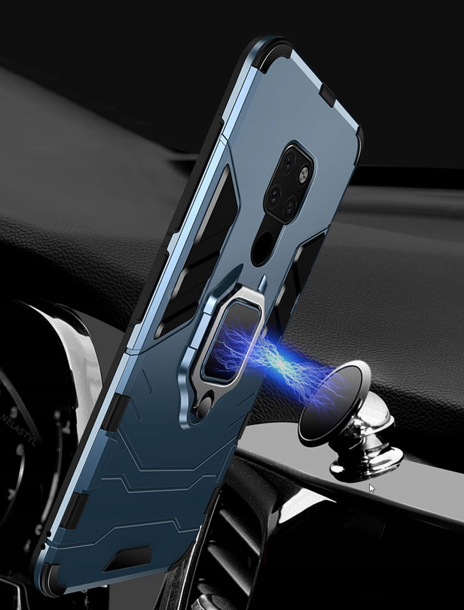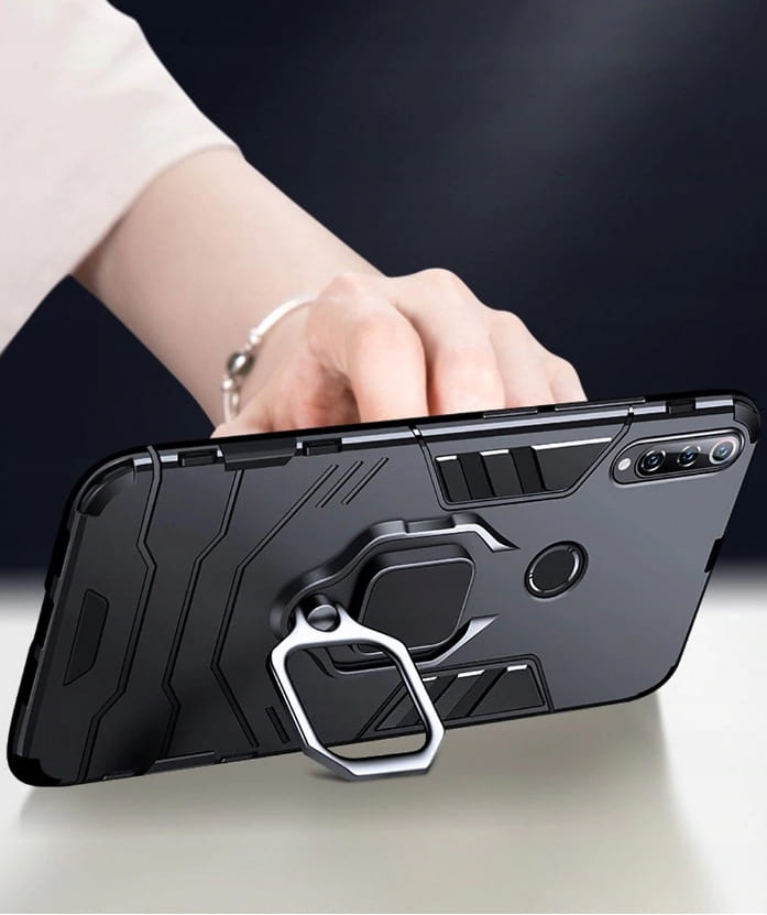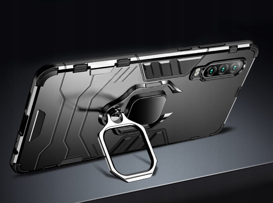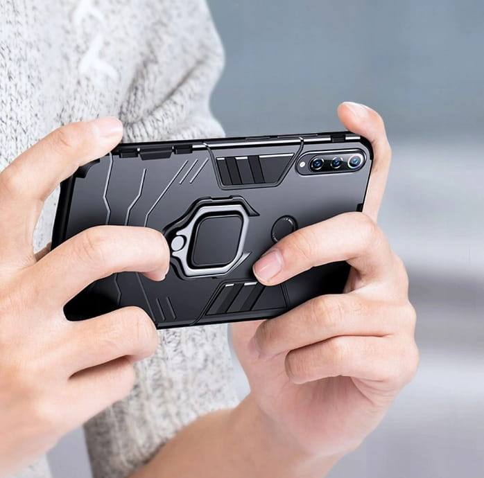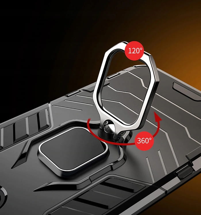 Posiada pierścień - wygodny uchwyt na palec zapobiegający niechcianym upadkom. Metalowy pierścień można obrócić o 360°. Umożliwia to poziome ustawienie telefonu pod optymalnym kątem. Dzięki takiemu rozwiązaniu pisanie na klawiaturze lub oglądanie filmów jest znacznie łatwiejsze i przyjemniejsze. Pokrowiec nie zakłóca działania telefonu dzięki osłonom na przyciski oraz wycięciom na porty, obiektywy i czujniki. Podniesione krawędzie chronią ekran przed zarysowaniem na płaskich powierzchniach. Obudowa do telefonu jest wykonana z bardzo trwałej gumy, która ochroni Twój telefon przed uszkodzeniami.