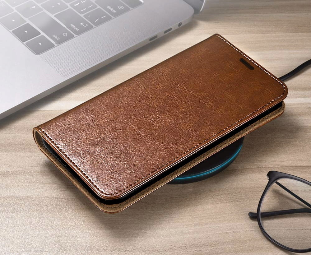 Elegancki skórzany futerał zapinany na magnes. Telefon mocowany jest do wewnętrznego szkieletu. Futerał został wykonany z dobrego jakościowo materiału. Jest starannie wykonany, a wzmocnione przeszycia gwarantują jego trwałość. W jego wnętrzu znajduje się dodatkowa kieszeń na kartę kredytową lub banknoty. Zapinanie na magnes chroni telefon przed wysunięciem, a także przed zarysowaniami i drobnymi uszkodzeniami.
