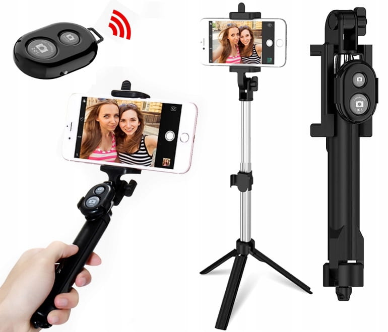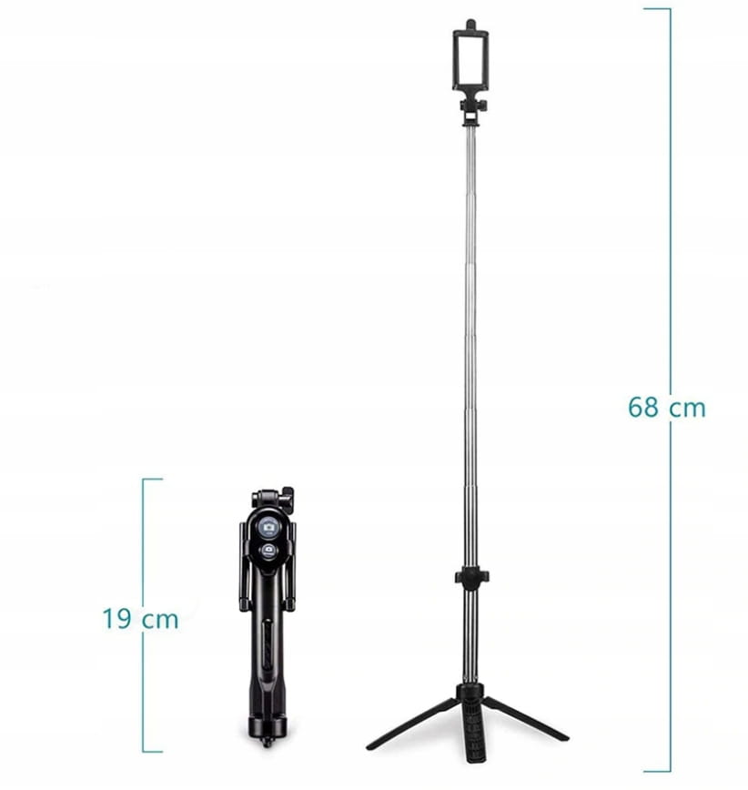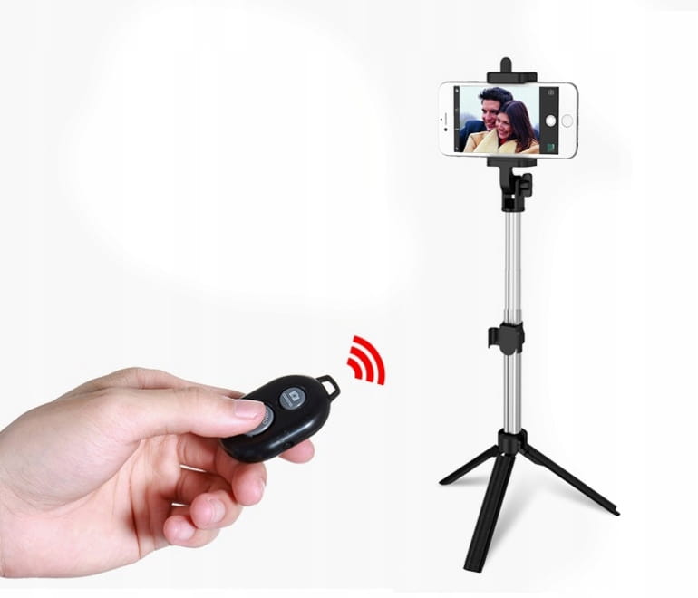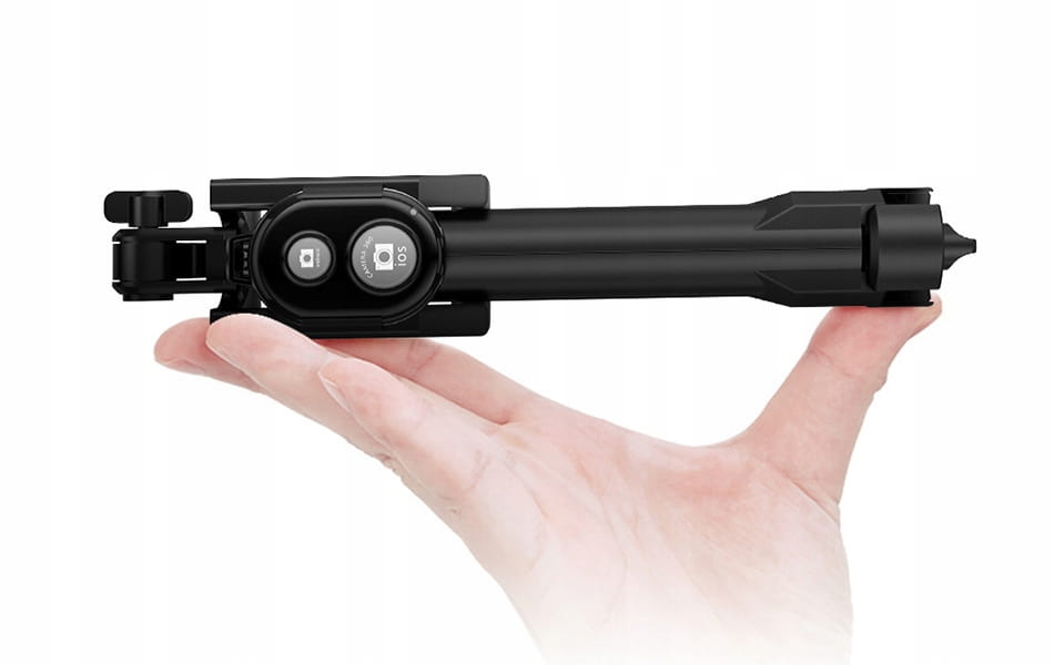 Dzięki składanej konstrukcji łatwo przejdziesz z zastosowania jako kijka selfie do opcji statywu. Ustawiając jako statyw zdjęcia wykonasz pilotem sparowanym z telefonem. Pilot posiada 2 przyciski (ANDROID/ iOS) oraz włącznik.