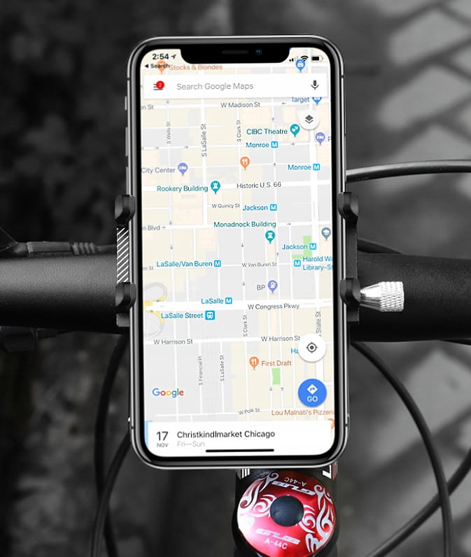 Uniwersalny uchwyt rowerowy idealnie nadaje się do montażu na kierownicy roweru, motoru, hulajnogi, wózka dla dziecka. Uniwersalna głowica trzyma bardzo mocno oraz posiada specjalny system mocowania. Mocowanie na kierownicy za pomocą objemki skręcanej śrubą.