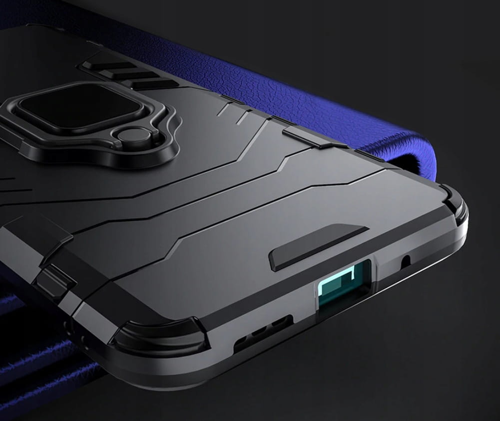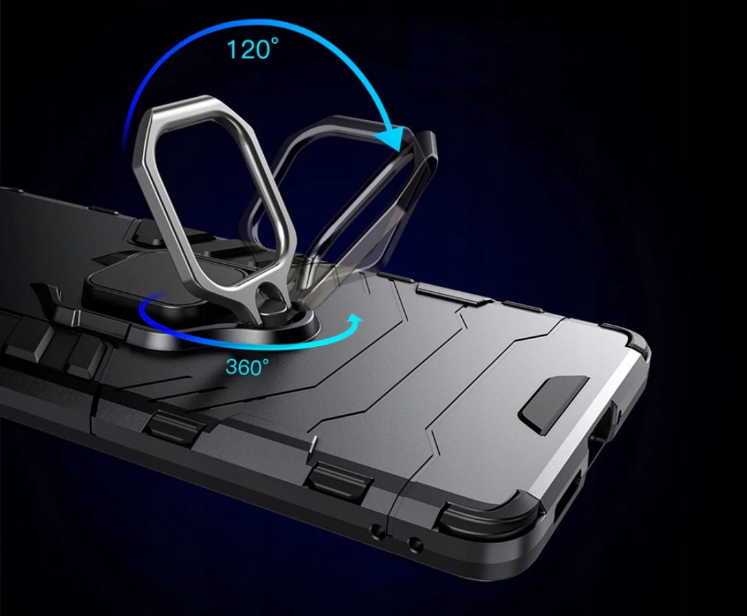 Posiada pierścień - wygodny uchwyt na palec zapobiegający niechcianym upadkom. Metalowy pierścień można obrócić o 360°. Umożliwia to poziome ustawienie telefonu pod optymalnym kątem. Dzięki takiemu rozwiązaniu pisanie na klawiaturze lub oglądanie filmów jest znacznie łatwiejsze i przyjemniejsze. Pokrowiec nie zakłóca działania telefonu dzięki osłonom na przyciski oraz wycięciom na porty, obiektywy i czujniki. Podniesione krawędzie chronią ekran przed zarysowaniem na płaskich powierzchniach. Obudowa do telefonu jest wykonana z bardzo trwałej gumy, która ochroni Twój telefon przed uszkodzeniami.