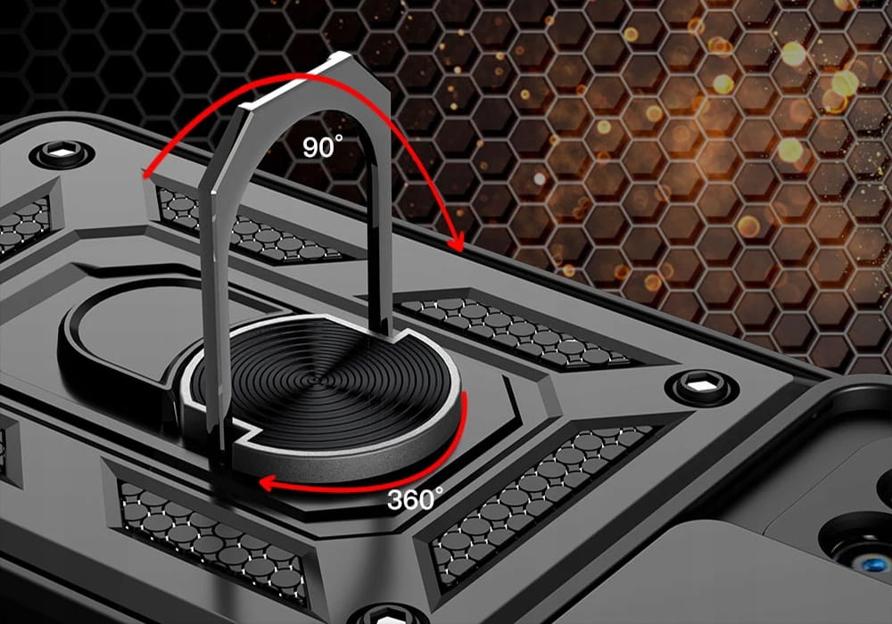 Posiada pierścień - wygodny uchwyt na palec zapobiegający niechcianym upadkom. Metalowy pierścień można obrócić o 360°. Umożliwia to poziome ustawienie telefonu pod optymalnym kątem. Dzięki takiemu rozwiązaniu pisanie na klawiaturze lub oglądanie filmów jest znacznie łatwiejsze i przyjemniejsze. Pokrowiec nie zakłóca działania telefonu dzięki osłonom na przyciski oraz wycięciom na porty, obiektywy i czujniki. Podniesione krawędzie chronią ekran przed zarysowaniem na płaskich powierzchniach. Obudowa do telefonu jest wykonana z bardzo trwałej gumy, która ochroni Twój telefon przed uszkodzeniami.