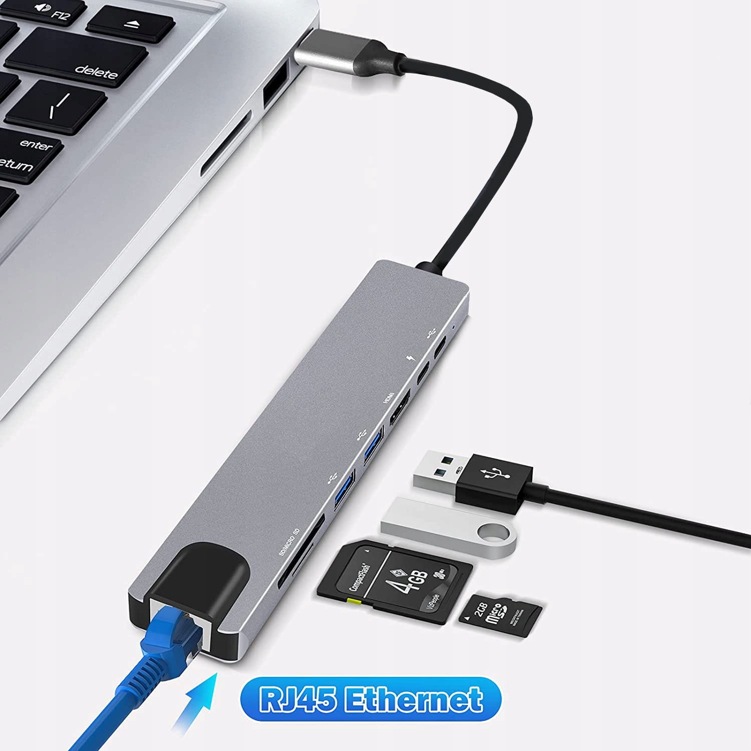 - 【Rozbudowany koncentrator USB C 8 w 1】 Adapter wieloportowy USB-c Hub zawiera szybki port Ethernet/RJ-45, port transmisji danych typu C 3.1 i port ładowania PD 87 W, 2 porty USB 3.0, wyjście wideo 4K HDMI. Czytnik kart Micro SD i TF.