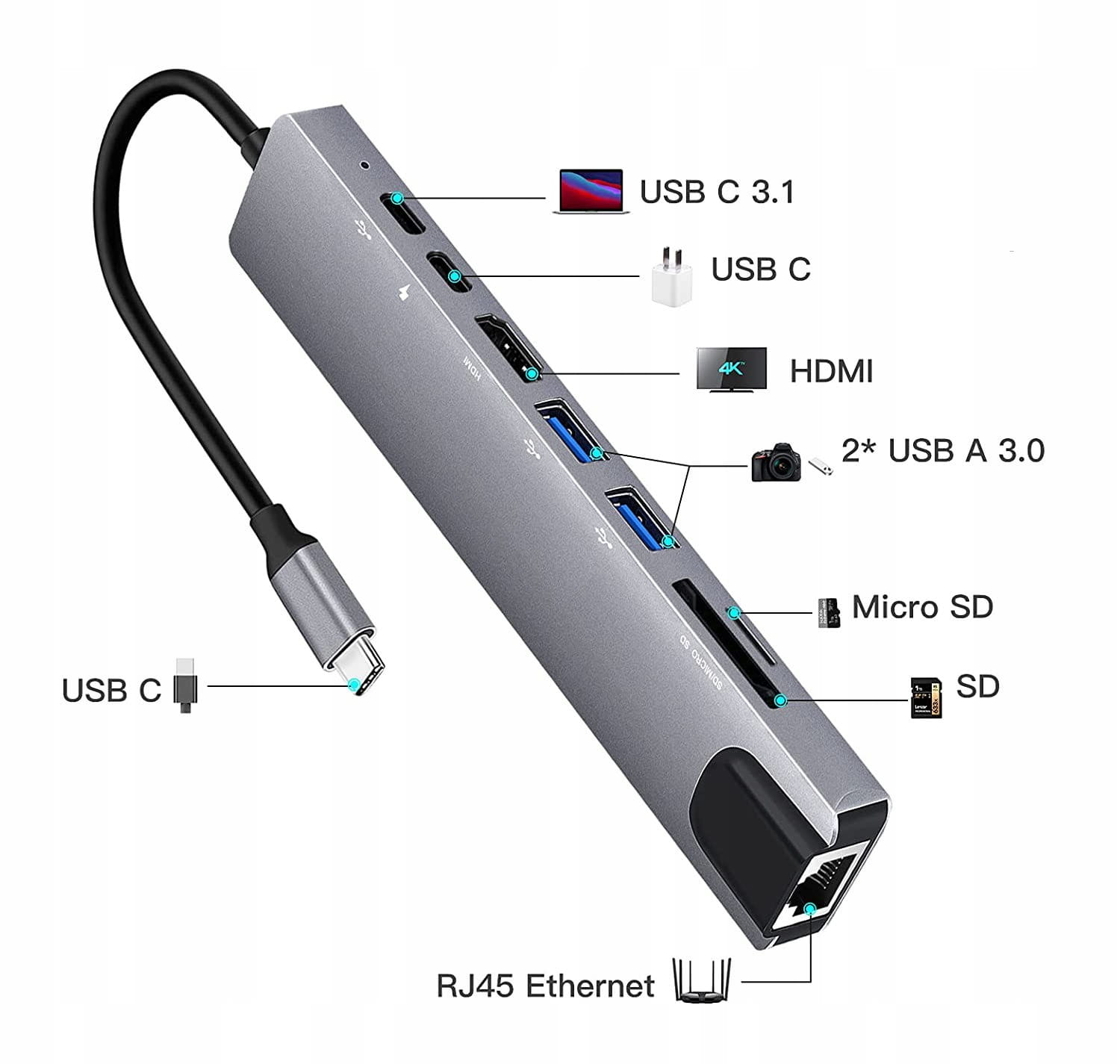 Adapter 9w1 HUB USB-C HDMI RJ45 Ethernet SD