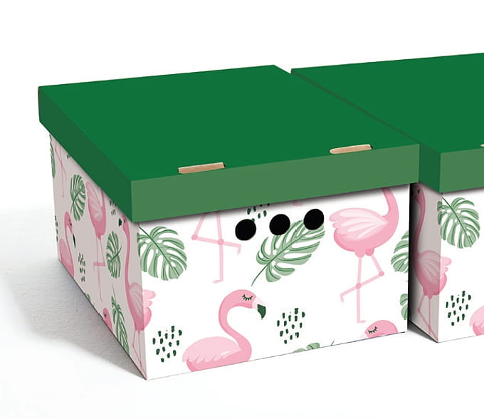 Pudełko jest wykonane z trwałego i mocnego kartonu, idealnie nadaje się do przechowywania różnych przedmiotów, takich jak ubrania, zabawki, książki i inne drobne rzeczy. Dzięki ozdobnemu nadrukowi może służyć jako dekoracja. Pudełka są bardzo łatwe w montażu i bez problemu można stawiać je na sobie.