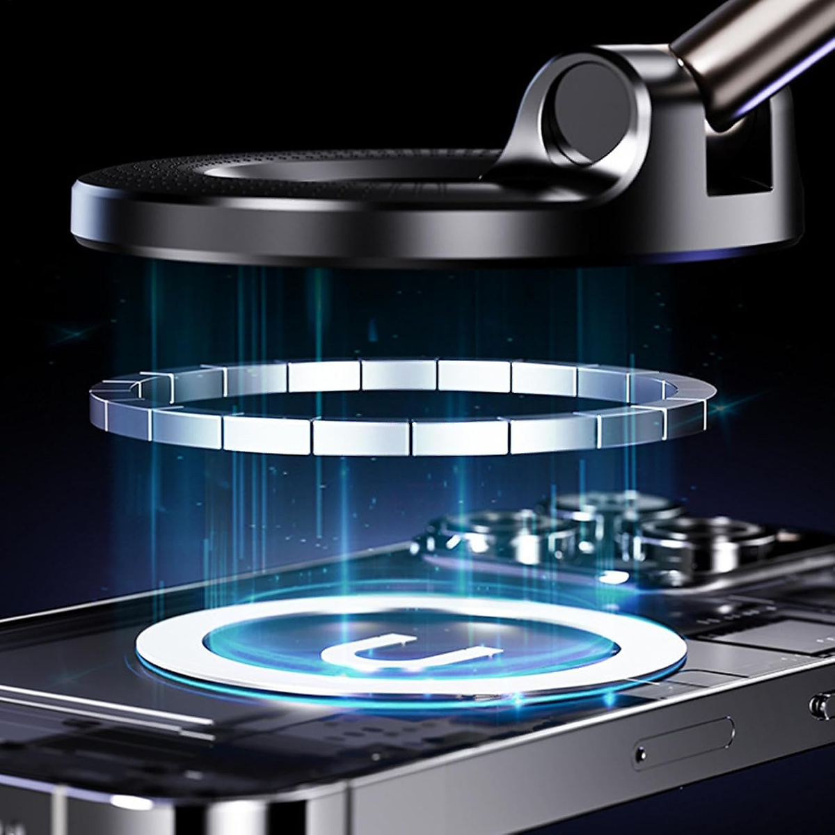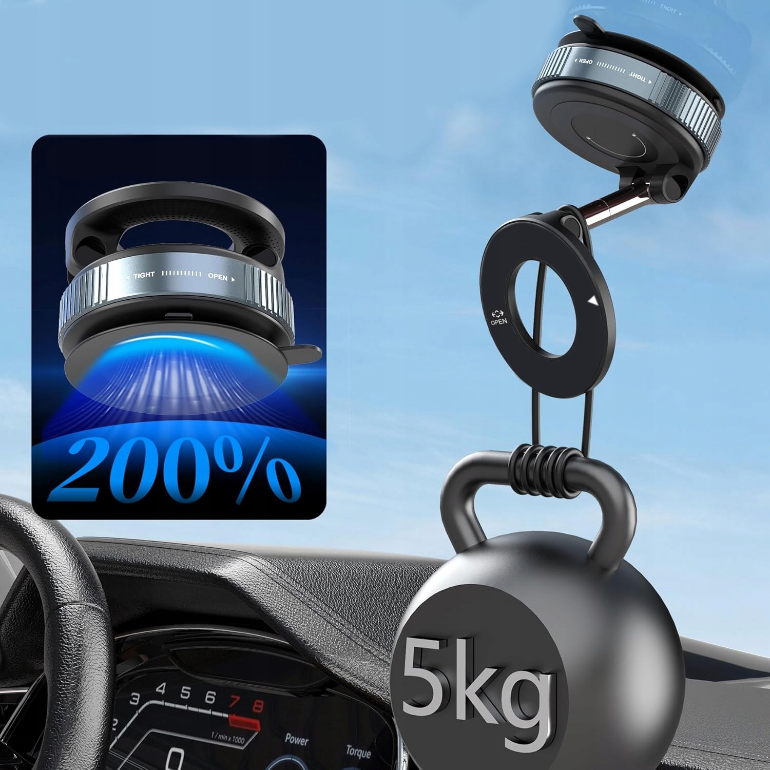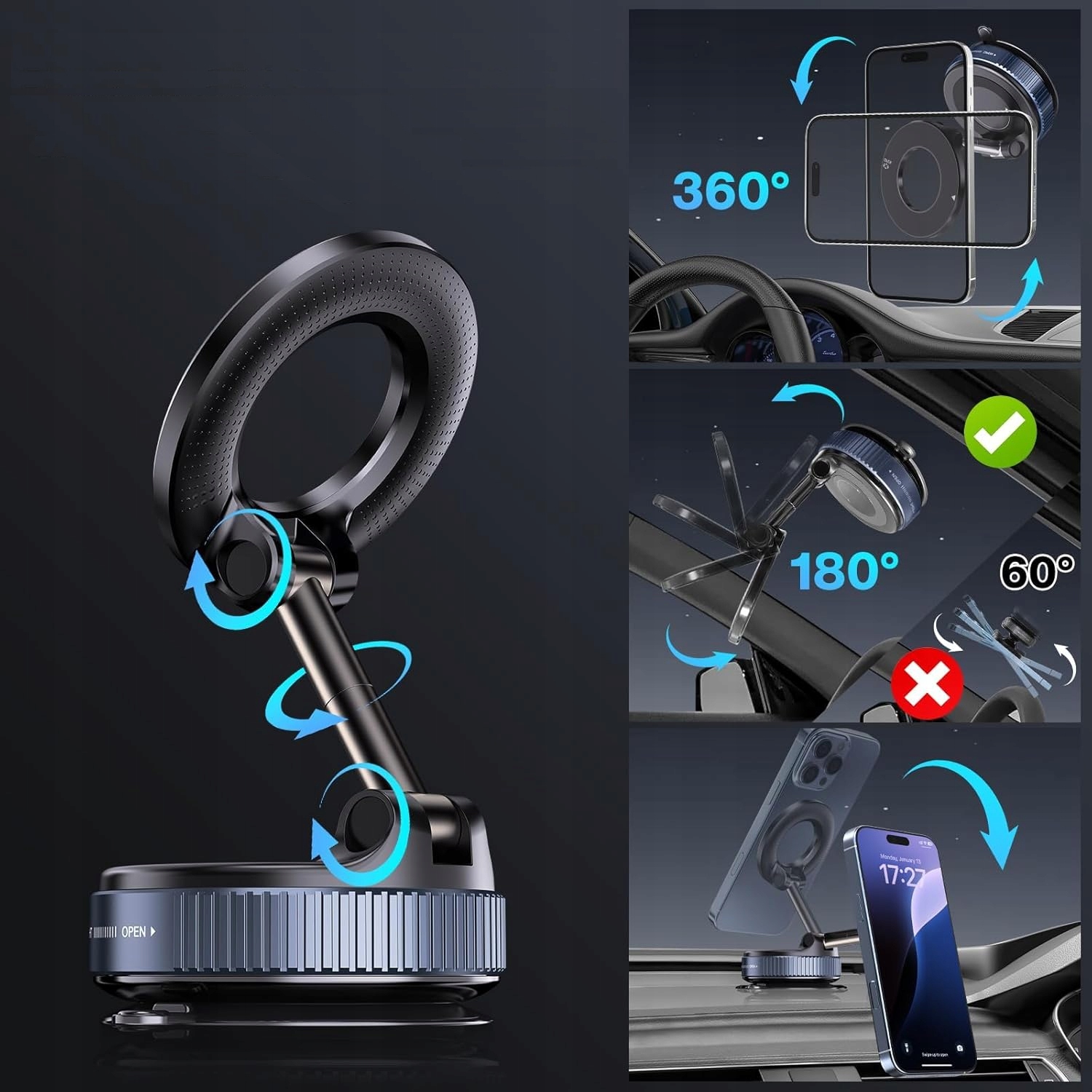 Nowoczesny magnetyczny uchwyt na telefon, który zapewnia stabilne i wygodne mocowanie smartfona w samochodzie. Dzięki mocnej przyssawce próżniowej i technologii MagSafe telefon szybko się montuje, co umożliwia wygodne korzystanie z nawigacji i rozmów podczas jazdy.