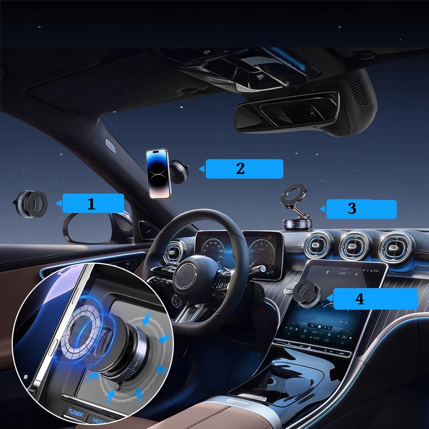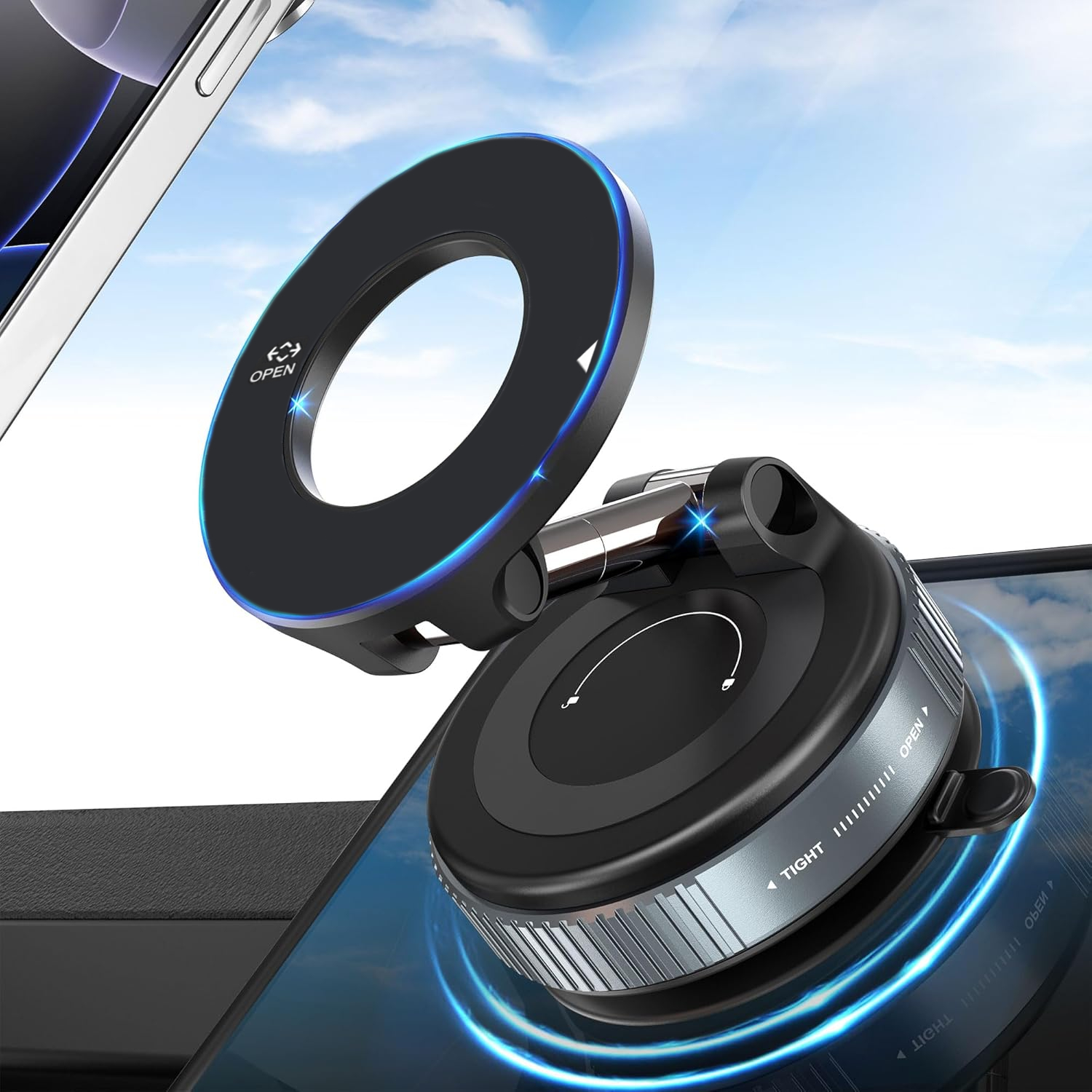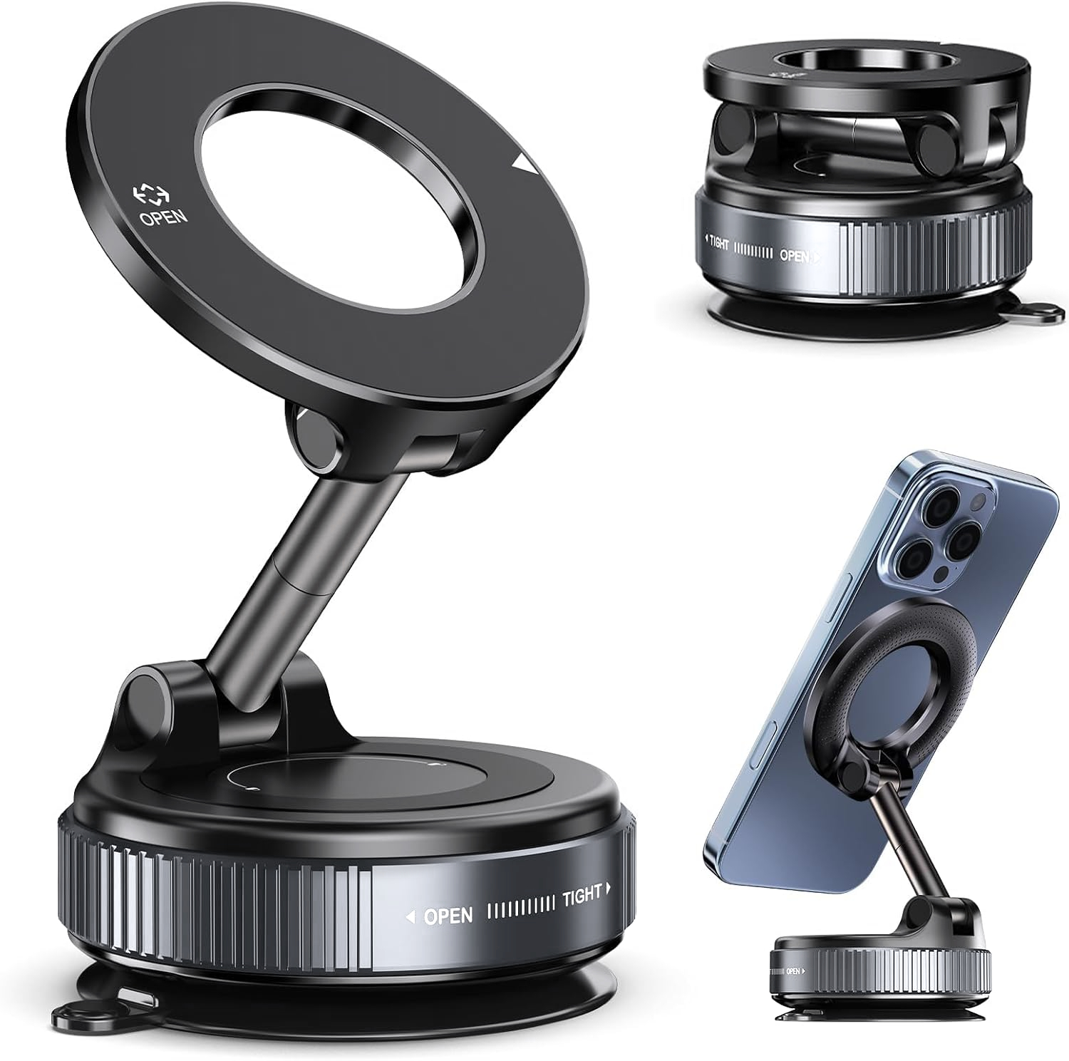 Nowoczesny magnetyczny uchwyt na telefon, który zapewnia stabilne i wygodne mocowanie smartfona w samochodzie. Dzięki mocnej przyssawce próżniowej i technologii MagSafe telefon szybko się montuje, co umożliwia wygodne korzystanie z nawigacji i rozmów podczas jazdy.