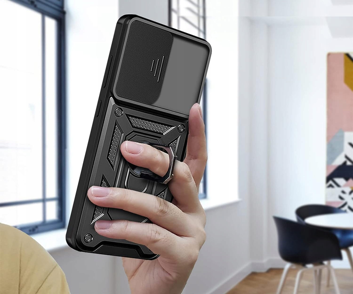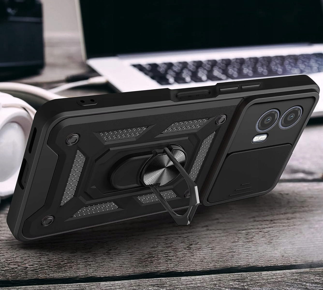 Posiada pierścień - wygodny uchwyt na palec zapobiegający niechcianym upadkom. Metalowy pierścień można obrócić o 360°. Umożliwia to poziome ustawienie telefonu pod optymalnym kątem. Dzięki takiemu rozwiązaniu pisanie na klawiaturze lub oglądanie filmów jest znacznie łatwiejsze i przyjemniejsze. Pokrowiec nie zakłóca działania telefonu dzięki osłonom na przyciski oraz wycięciom na porty, obiektywy i czujniki. Podniesione krawędzie chronią ekran przed zarysowaniem na płaskich powierzchniach. Obudowa do telefonu jest wykonana z bardzo trwałej gumy, która ochroni Twój telefon przed uszkodzeniami.