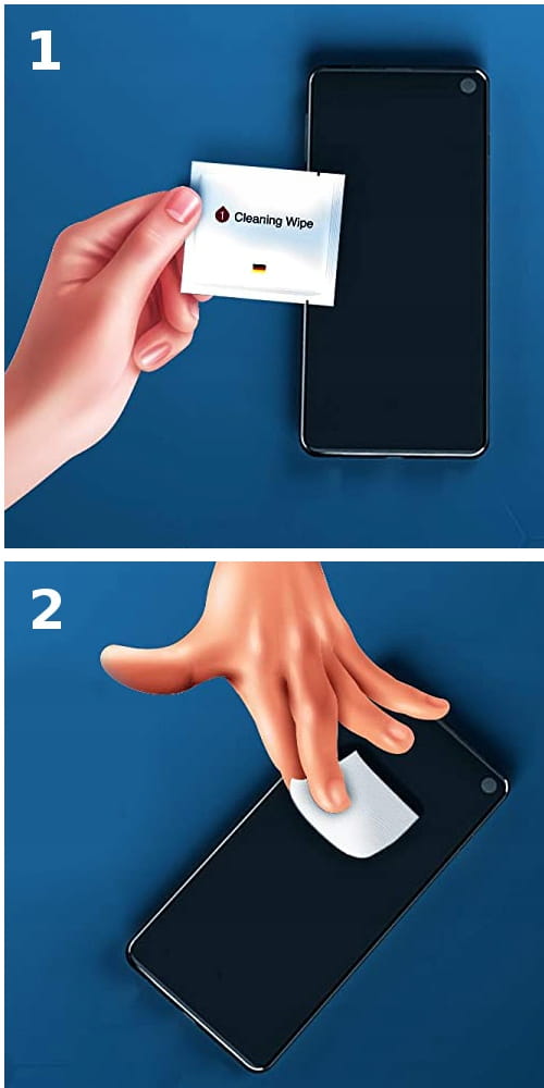 1. Użyj ściereczki mokrej z dołączonego zestawu do wyczyszczenia ekranu a następnie suchej do wytarcia na sucho.