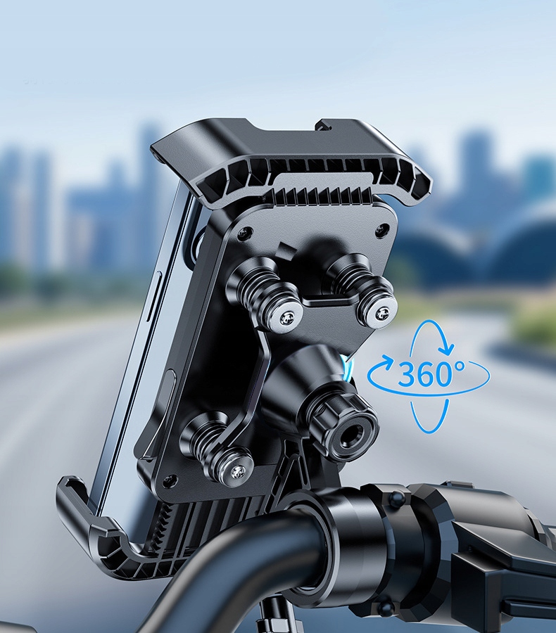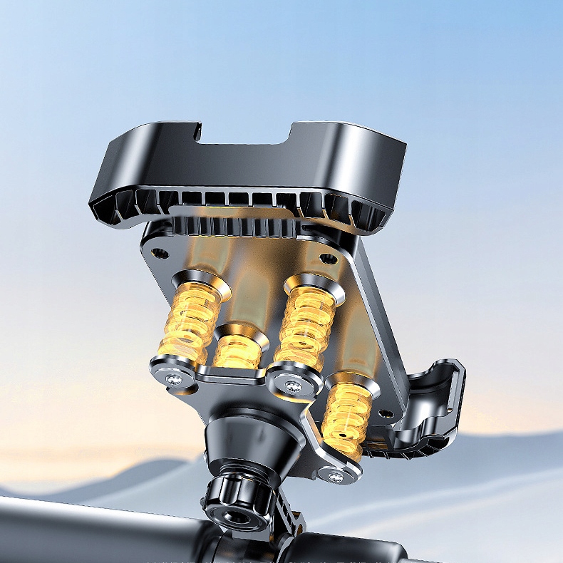 Metalowy zacisk z czterema punktami podparcia utrzymuje telefon w stabilnej pozycji nawet podczas jazdy po wyboistych drogach. Dodatkowe zabezpieczenie oraz przycisk zwolnienia zacisku zapobiegają przypadkowemu otwarciu uchwytu.