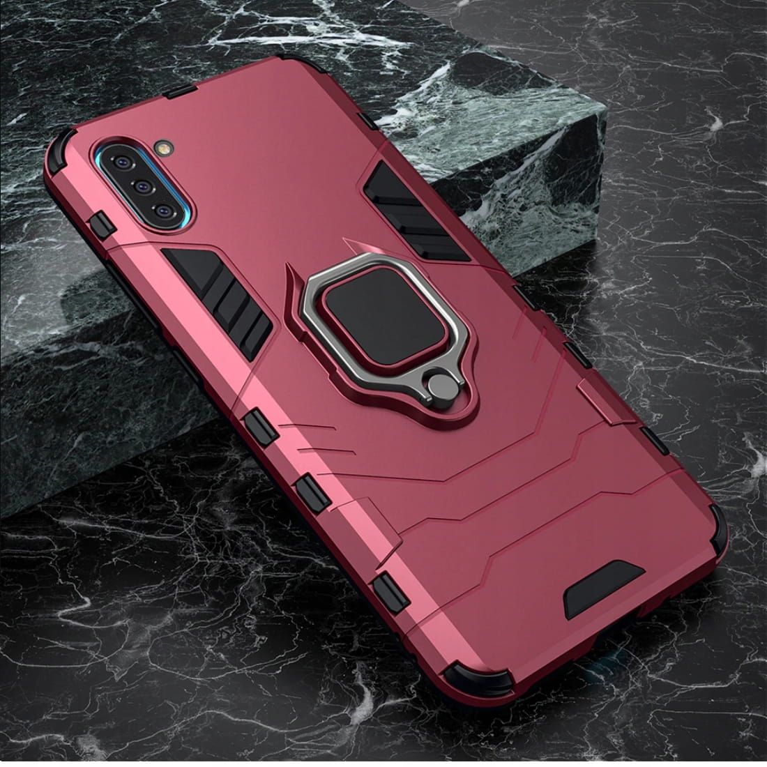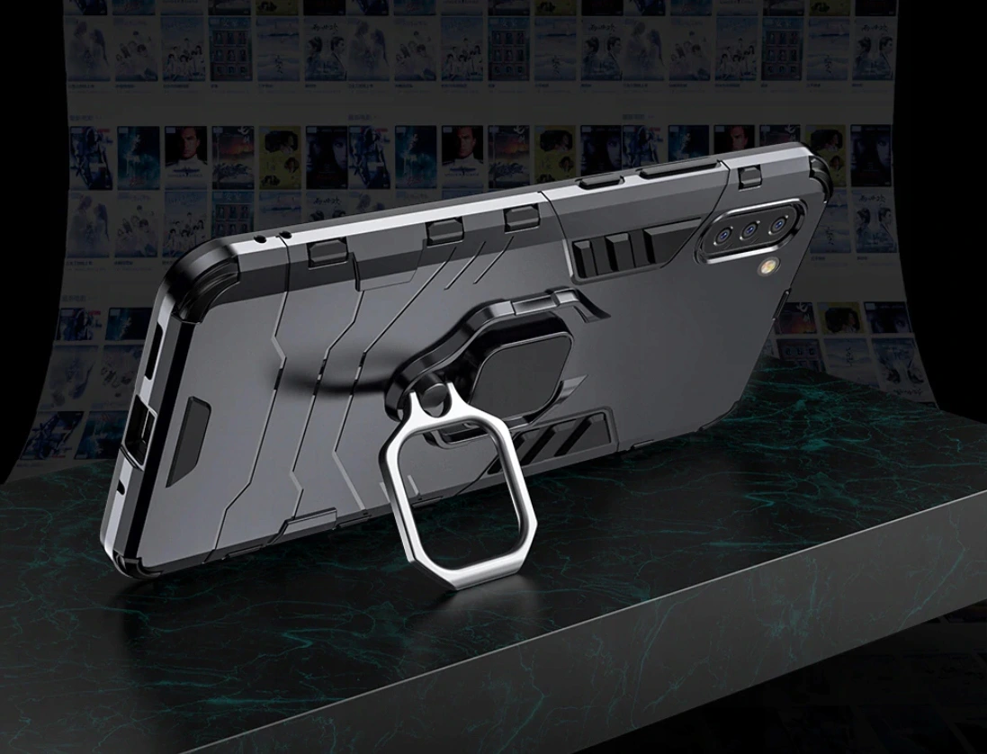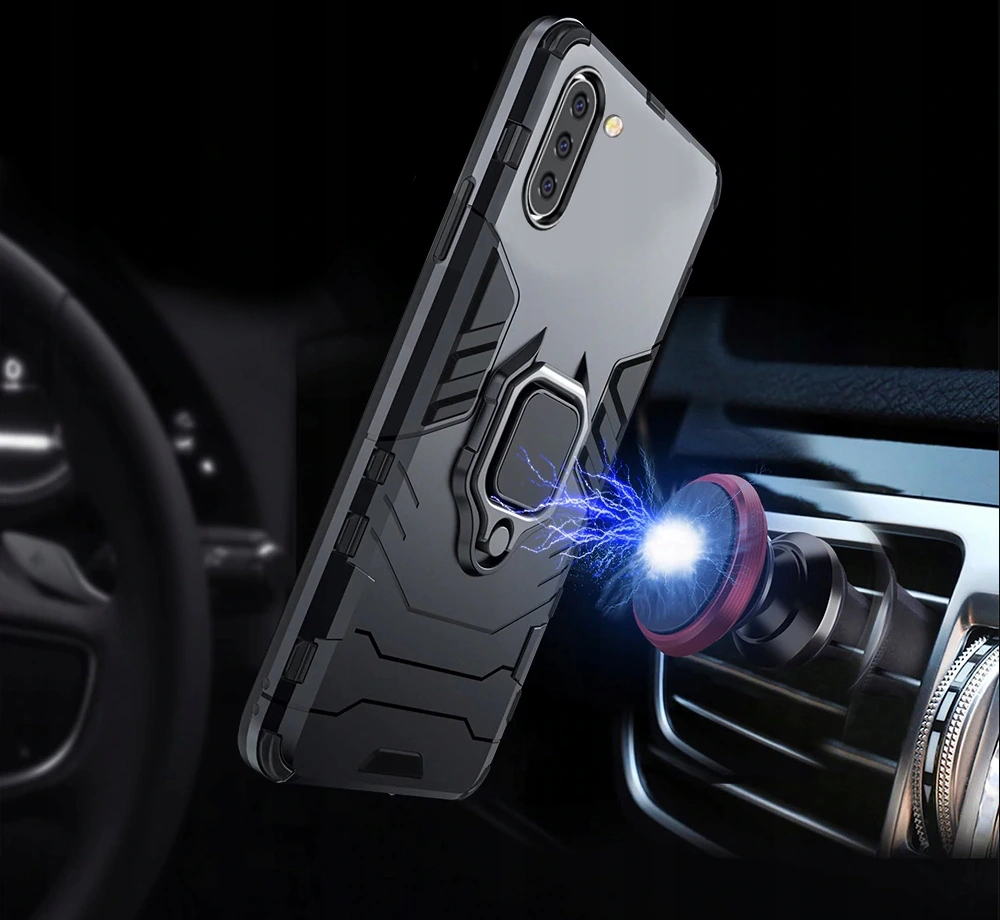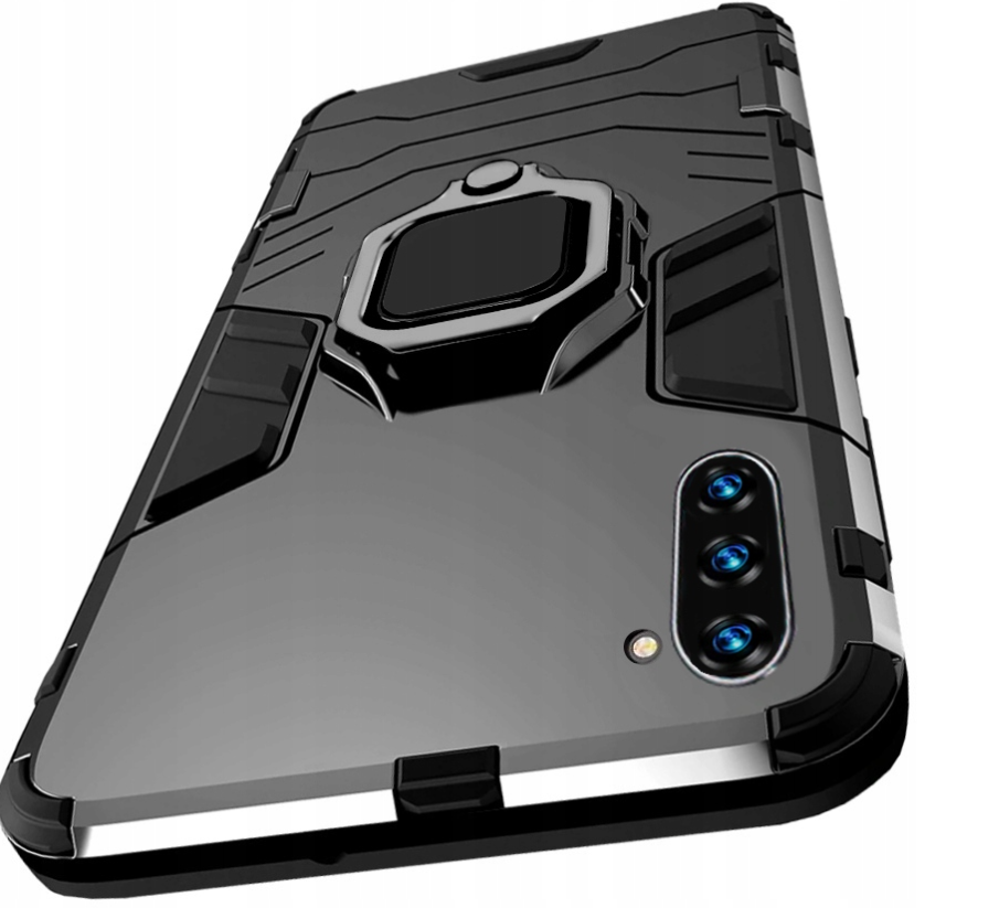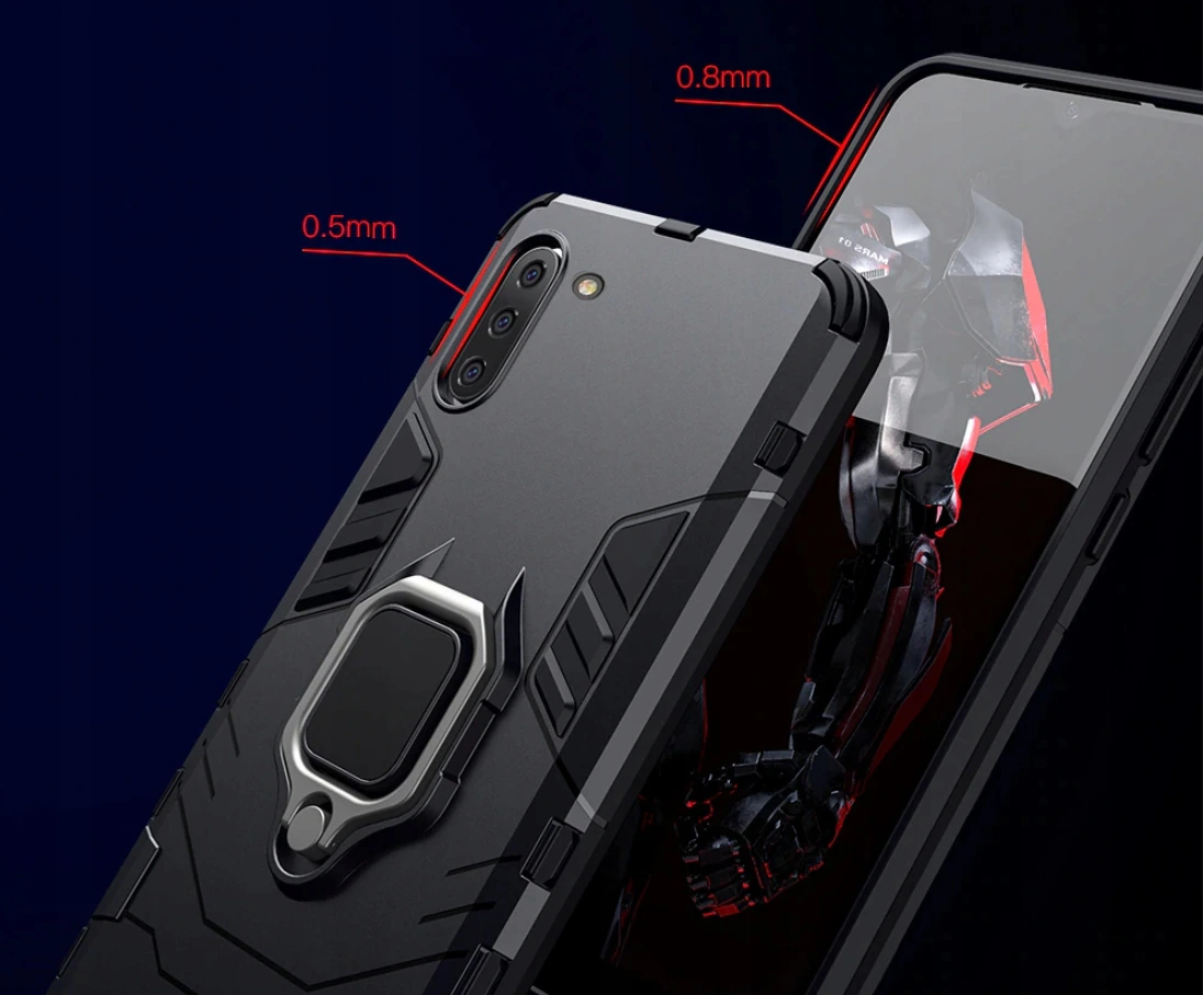 Posiada pierścień - wygodny uchwyt na palec zapobiegający niechcianym upadkom. Metalowy pierścień można obrócić o 360°. Umożliwia to poziome ustawienie telefonu pod optymalnym kątem. Dzięki takiemu rozwiązaniu pisanie na klawiaturze lub oglądanie filmów jest znacznie łatwiejsze i przyjemniejsze. Pokrowiec nie zakłóca działania telefonu dzięki osłonom na przyciski oraz wycięciom na porty, obiektywy i czujniki. Podniesione krawędzie chronią ekran przed zarysowaniem na płaskich powierzchniach. Case, obudowa do telefonu jest wykonana z bardzo trwałej gumy, która ochroni Twój telefon przed uszkodzeniami.