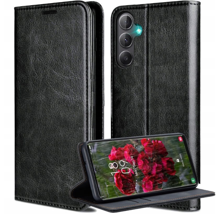 Elegancki skórzany futerał zapinany na magnes. Telefon mocowany jest do wewnętrznego szkieletu. Futerał został wykonany z dobrego jakościowo materiału. Jest starannie wykonany, a wzmocnione przeszycia gwarantują jego trwałość. W jego wnętrzu znajduje się dodatkowa kieszeń na kartę kredytową lub banknoty. Zapinanie na magnes chroni telefon przed wysunięciem, a także przed zarysowaniami i drobnymi uszkodzeniami.