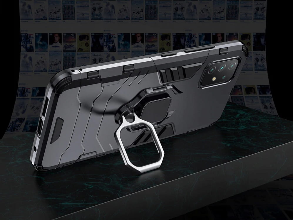 Posiada pierścień - wygodny uchwyt na palec zapobiegający niechcianym upadkom. Metalowy pierścień można obrócić o 360°. Umożliwia to poziome ustawienie telefonu pod optymalnym kątem. Dzięki takiemu rozwiązaniu pisanie na klawiaturze lub oglądanie filmów jest znacznie łatwiejsze i przyjemniejsze. Pokrowiec nie zakłóca działania telefonu dzięki osłonom na przyciski oraz wycięciom na porty, obiektywy i czujniki. Podniesione krawędzie chronią ekran przed zarysowaniem na płaskich powierzchniach. Obudowa do telefonu jest wykonana z bardzo trwałej gumy, która ochroni Twój telefon przed uszkodzeniami.