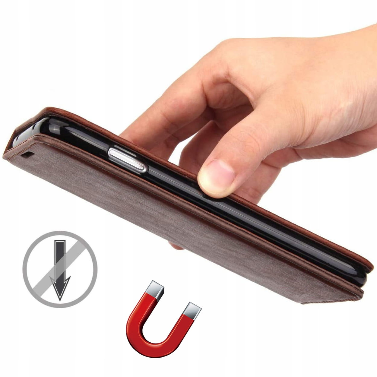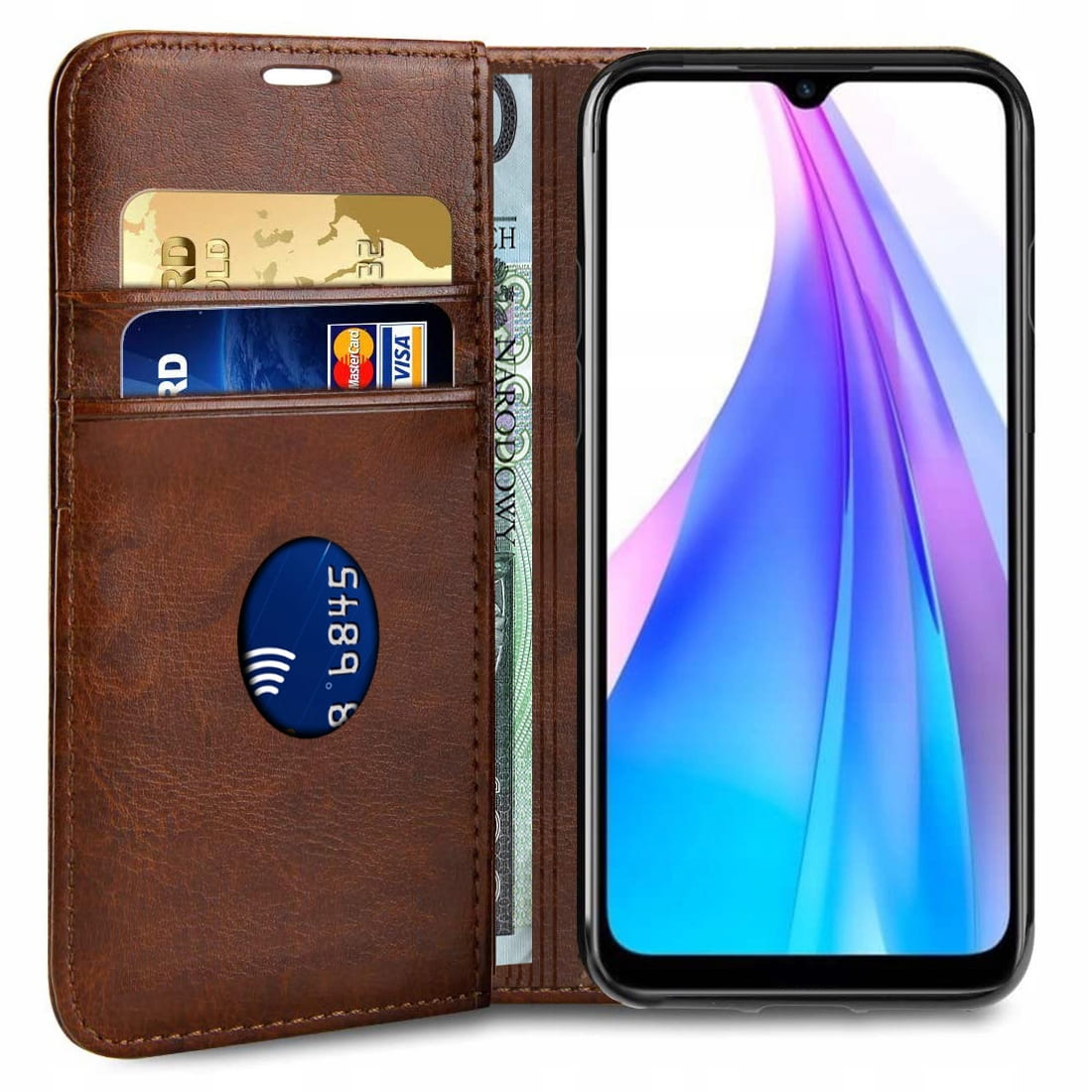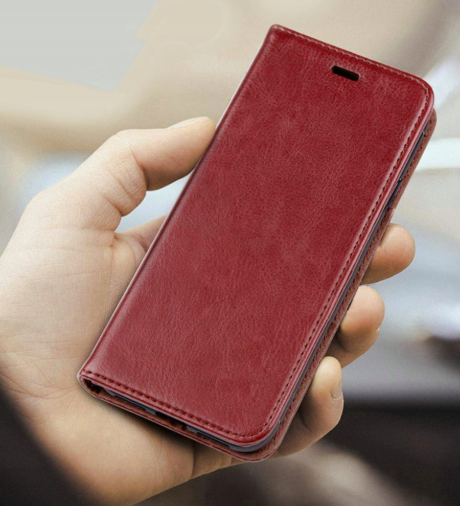 Elegancki skórzany futerał zapinany na magnes. Telefon mocowany jest do wewnętrznego szkieletu. Futerał został wykonany z dobrego jakościowo materiału. Jest starannie wykonany, a wzmocnione przeszycia gwarantują jego trwałość. W jego wnętrzu znajduje się dodatkowa kieszeń na kartę kredytową lub banknoty. Zapinanie na magnes chroni telefon przed wysunięciem, a także przed zarysowaniami i drobnymi uszkodzeniami.