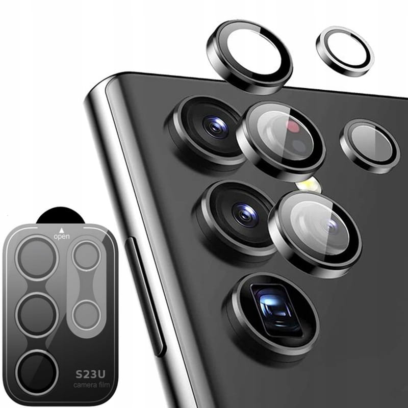 Samsung Galaxy S24 Ultra, Szkło hartowane na aparat, aluminiowa czarna ramka
