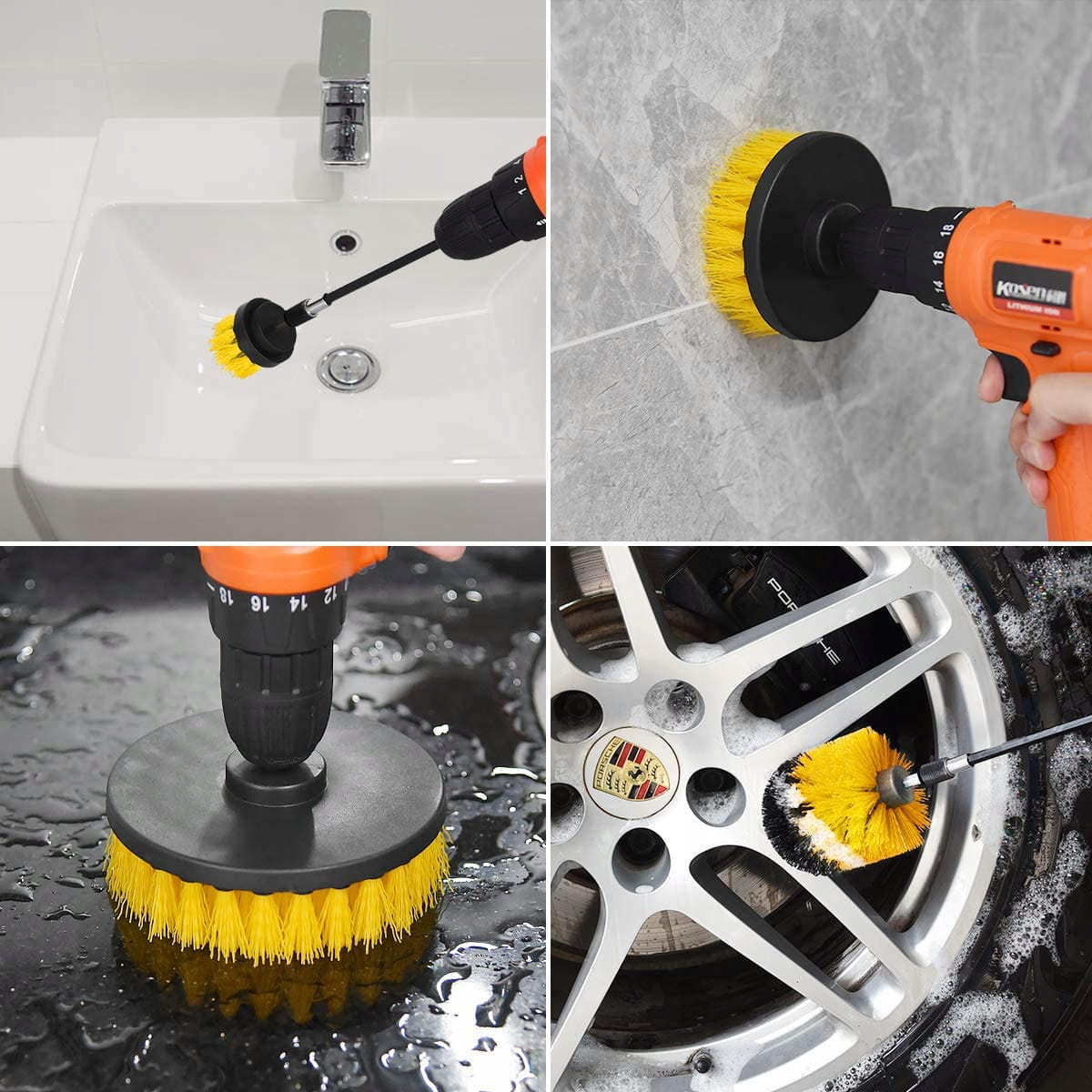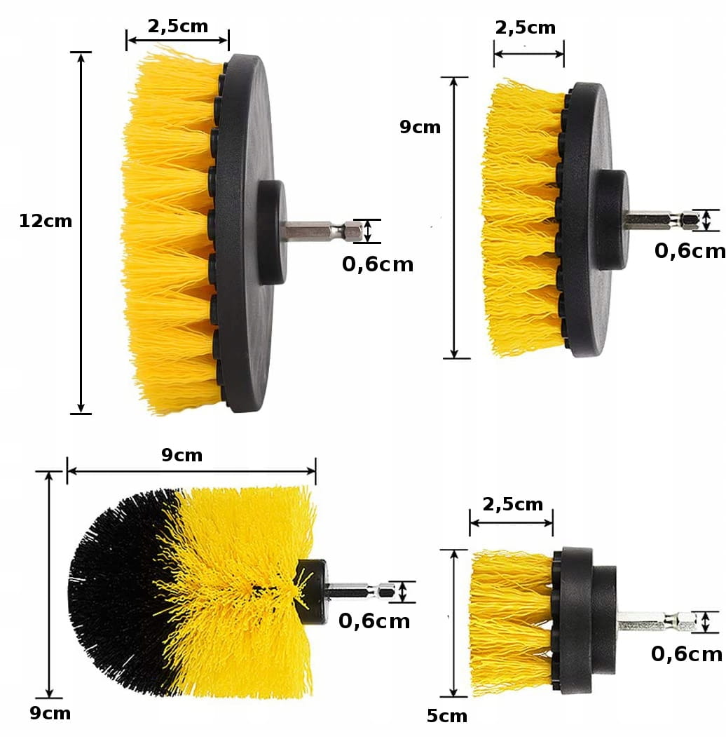 Zestaw 11 szczotek mocowanych na wiertarkę lub wkrętarkę, szczotki są wykonane ze średniej twardości nylonu, który podczas użytkowania nie rozchodzi się na boki, a włosie, z którego są zrobione nie wypada, cała konstrukcja jest wykonana w sposób solidny i trwały, a materiały, użyte przy produkcji są odporne na chemikalia, szczotkami można wyczyścić złącza, pokrowce, koła samochodu lub brudne naczynia, skuteczne czyszczenie nietypowych i trudno dostępnych miejsc