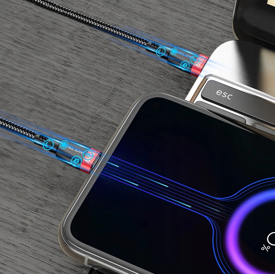 Uniwersalny kabel do ładowania wszystkich urządzeń, posiada 3 różne końcówki do ładowania - IPHONE LIGHTNING, MICRO-USB i USB-C, aluminiowa osłona i nylonowy oplot kabla, długość 1,2 metra