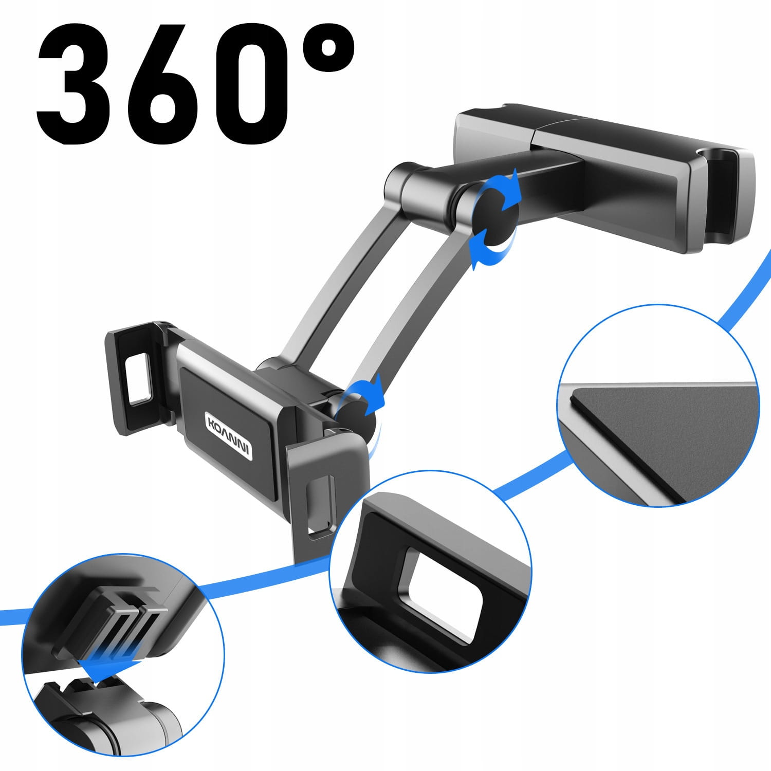 Uchwyt dostosowany do obsługi tabletu, smartfona, e-czytnika oraz pozostałych urządzeń. Konstrukcja składana pozwala do dopasowanie kąta i odległości oglądanych treści. Możliwość regulacji położenia urządzenia w pionie. Pozwala przybliżyć uchwyt z urządzeniem mobilnym do siebie, aby móc nim sterować podczas gry lub oglądania filmów. Uniwersalne mocowanie zagłówkowe - zaciski są rozsuwane dzięki czemu pasuje do każdego zagłówka.