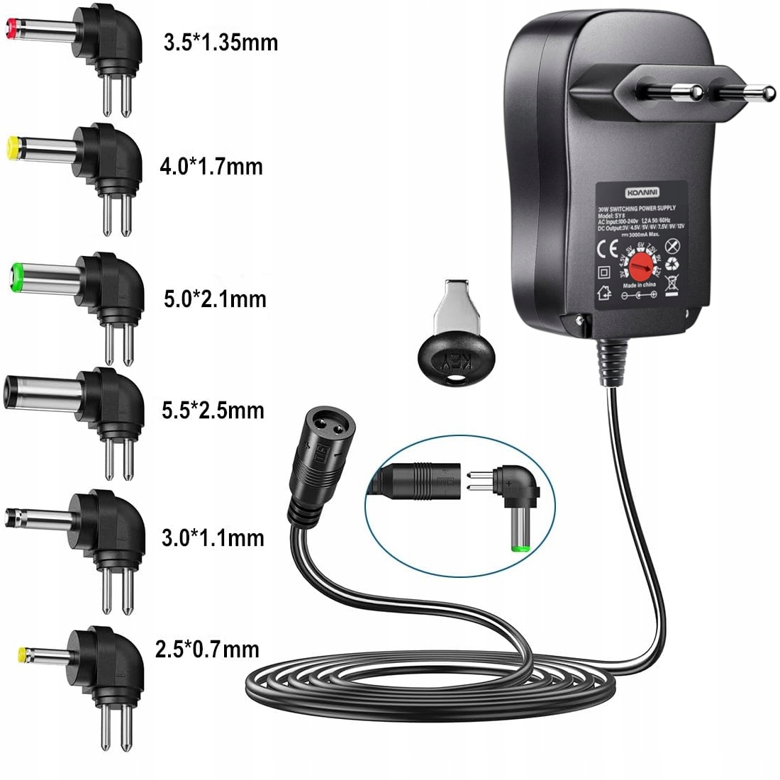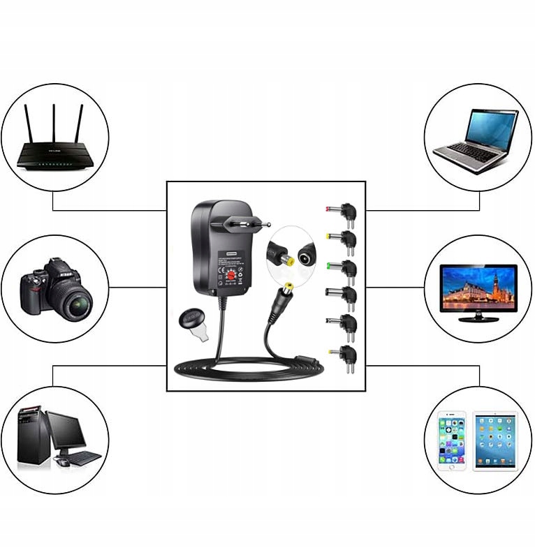 Uniwersalny zasilacz sieciowy z regulacją napięcia i dodatkowymi końcówkami to idealne rozwiązanie dla każdego, kto korzysta z różnych urządzeń elektronicznych. Dzięki szerokiemu zakresowi napięcia (3V–12V) oraz 6 wymiennym końcówkom, bez problemu dopasujesz go do większości sprzętów dostępnych na rynku.