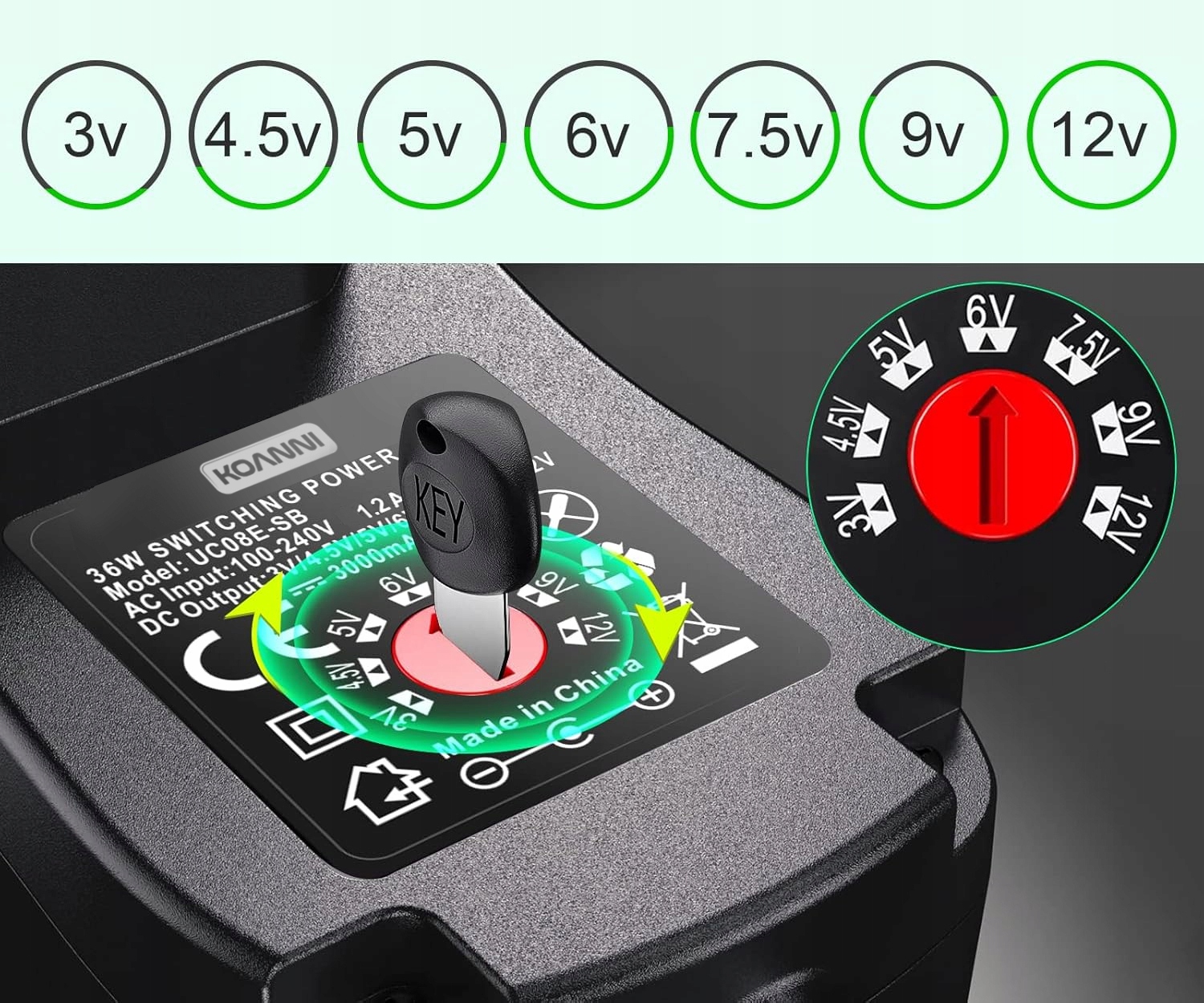 Regulowane napięcie: 3V / 4.5V / 5V / 6V / 7.5V / 9V / 12V – dopasuj zasilanie do potrzeb urządzenia