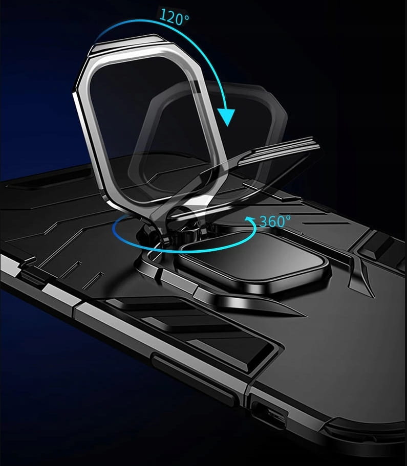 Posiada pierścień - wygodny uchwyt na palec zapobiegający niechcianym upadkom. Metalowy pierścień można obrócić o 360°. Umożliwia to poziome ustawienie telefonu pod optymalnym kątem. Dzięki takiemu rozwiązaniu pisanie na klawiaturze lub oglądanie filmów jest znacznie łatwiejsze i przyjemniejsze. Pokrowiec nie zakłóca działania telefonu dzięki osłonom na przyciski oraz wycięciom na porty, obiektywy i czujniki. Podniesione krawędzie chronią ekran przed zarysowaniem na płaskich powierzchniach. Obudowa do telefonu jest wykonana z bardzo trwałej gumy, która ochroni Twój telefon przed uszkodzeniami.