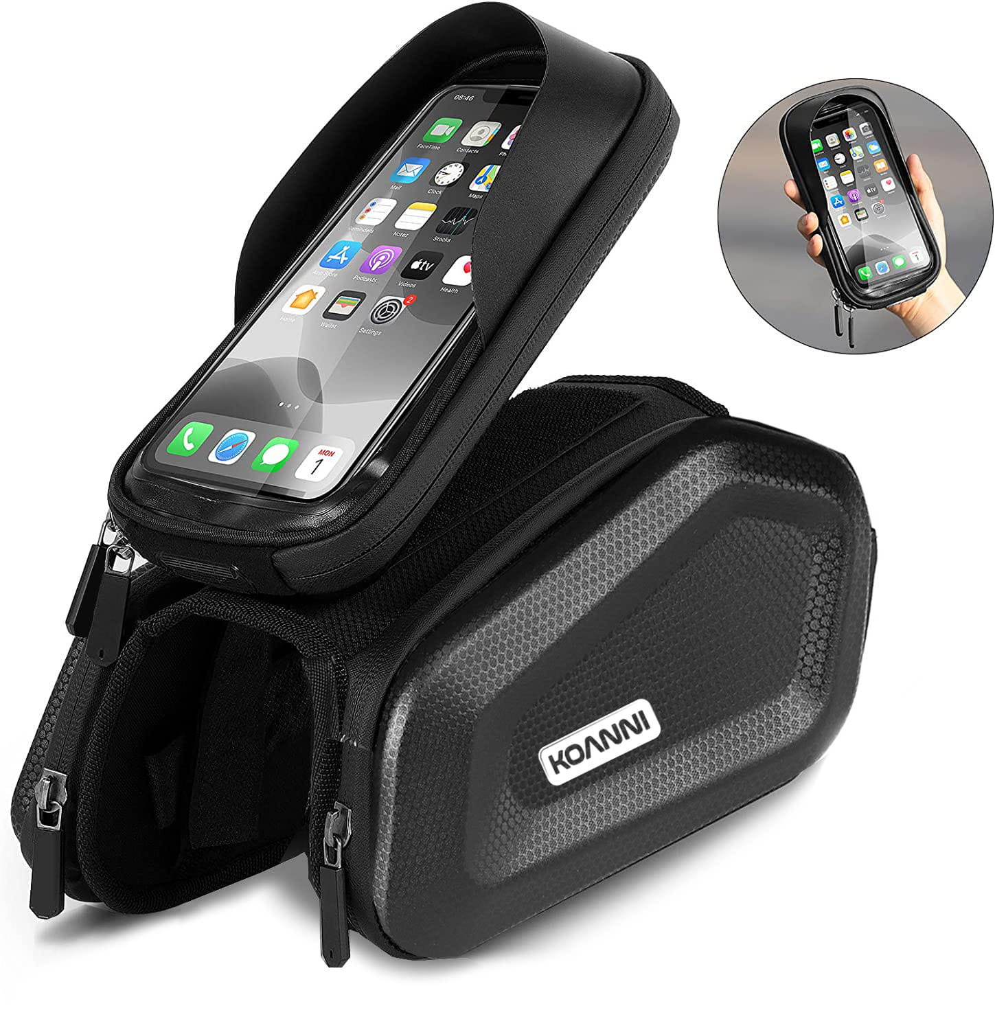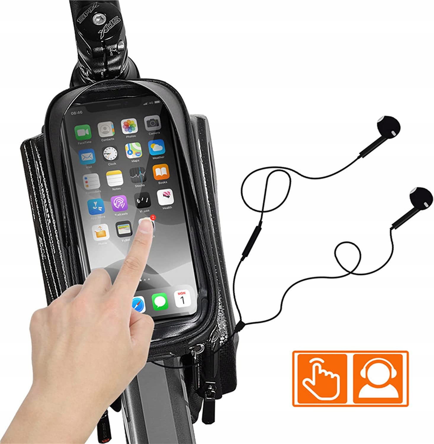 Silikonowy front przewodzi dotyk umożliwiając użytkowanie telefonu bez wyciągania go, a wszyte gumki oraz zapięcie na rzep dodatkowo zabezpieczy smartfon przed wysunięciem się. Miejsce na telefon wyłożone gąbką PE.