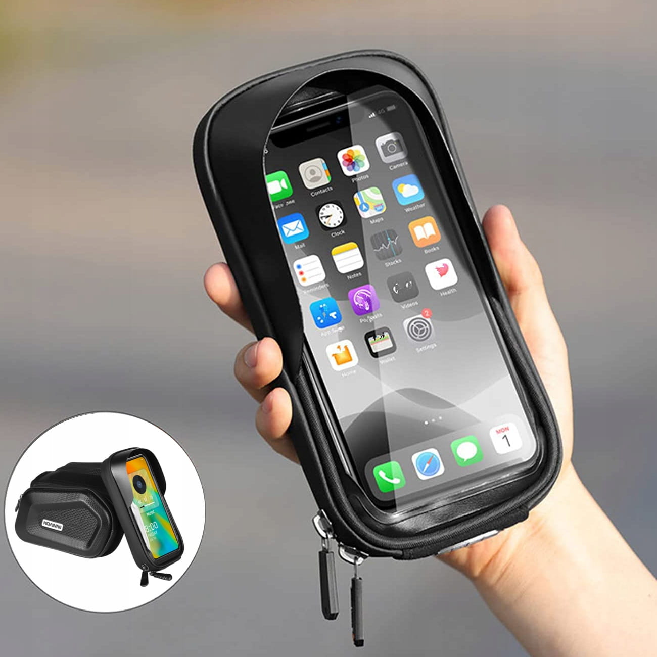 - Wymiary (przezroczysty front): 19 x 9 cm (pomieści telefon do 7,2")
