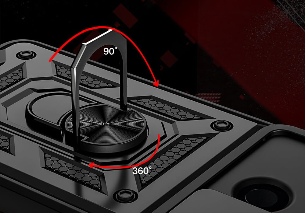 Posiada pierścień - wygodny uchwyt na palec zapobiegający niechcianym upadkom. Metalowy pierścień można obrócić o 360°. Umożliwia to poziome ustawienie telefonu pod optymalnym kątem. Dzięki takiemu rozwiązaniu pisanie na klawiaturze lub oglądanie filmów jest znacznie łatwiejsze i przyjemniejsze. Pokrowiec nie zakłóca działania telefonu dzięki osłonom na przyciski oraz wycięciom na porty, obiektywy i czujniki. Podniesione krawędzie chronią ekran przed zarysowaniem na płaskich powierzchniach. Obudowa do telefonu jest wykonana z bardzo trwałej gumy, która ochroni Twój telefon przed uszkodzeniami.